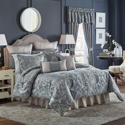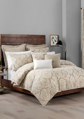 A stunning floral damask pattern rendered in shades of clean ivory and taupe lends stylish elegance to the beautiful blue ground of this gabrijel comforter set from croscill and any room's look.